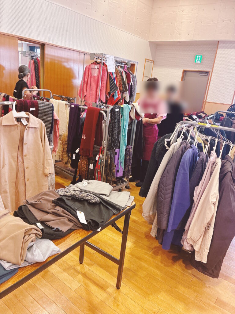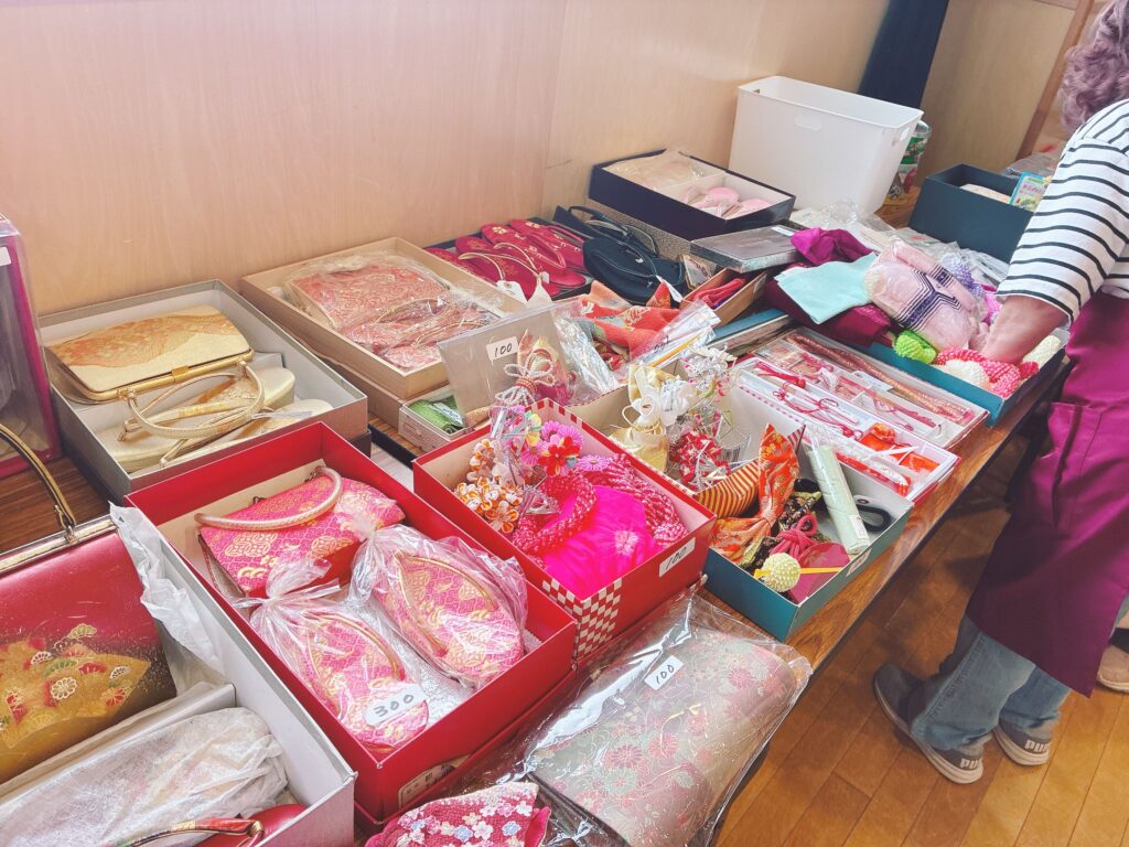 バザー会場は2つほどありますが、第2・第3集会室では、衣類などがメインに置かれているエリア。古着メインでコートやジャケットなどのほかに、下のように着物や帯なども出品されます。